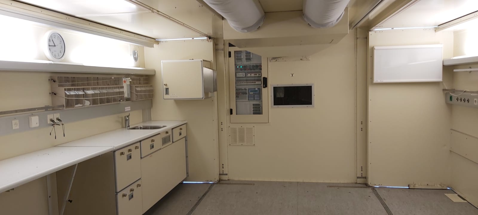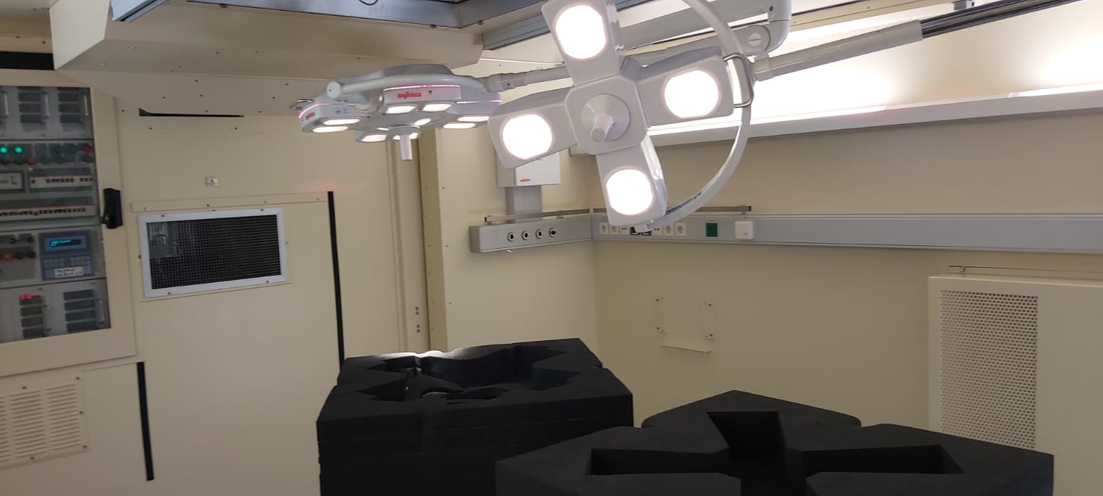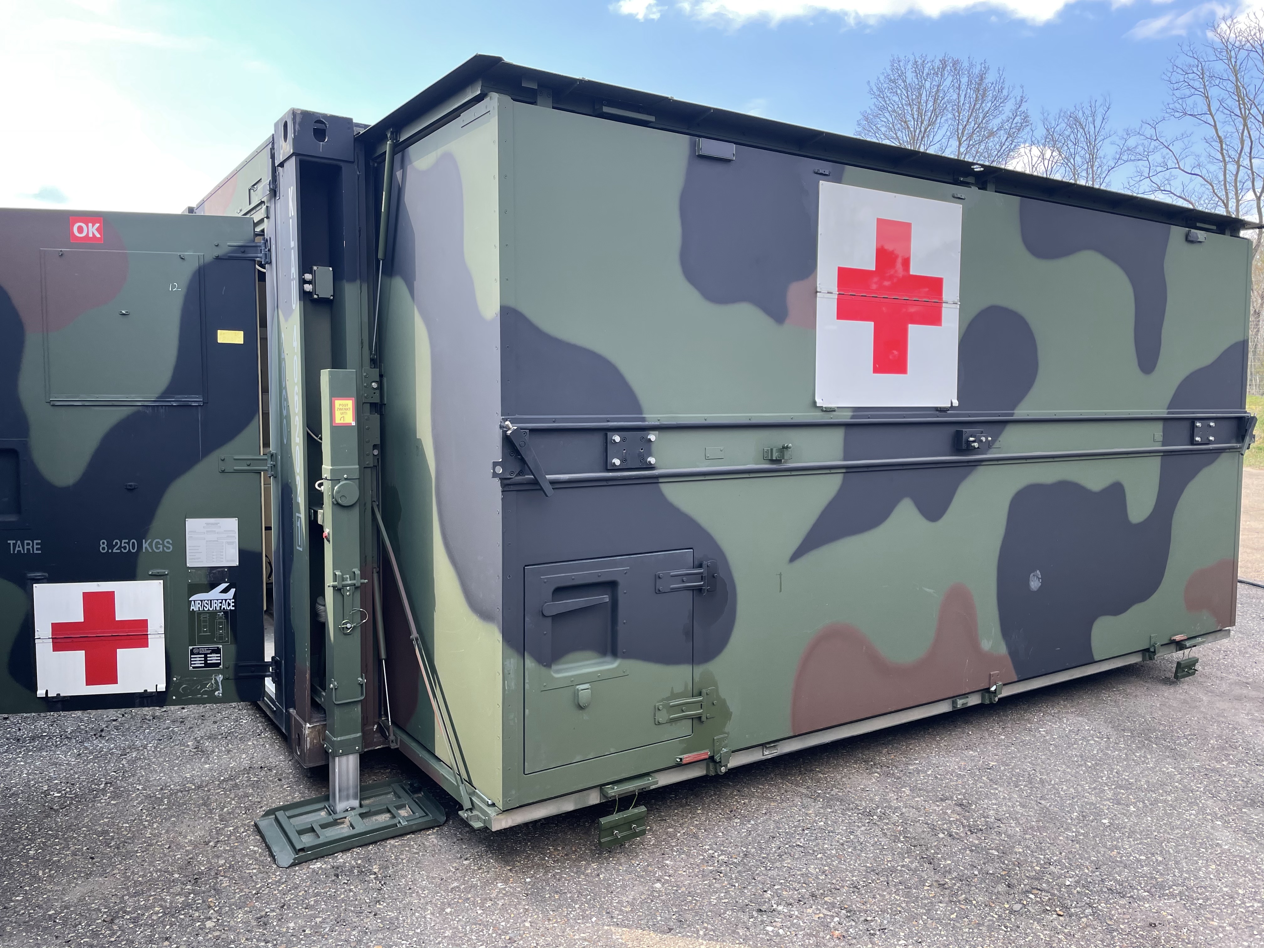 1x Generator Container with 2 generators inside 1x Airco/ Oxygen Container 2x Surgical Containers (with slide out sides) 3x Intensive Care Containers for up to 4 patients per Container (with slide out sides) 1x X-ray Container (currently no X-ray system inside) (with slide out sides) 1x Storage Container 4x Container to link all Containers together The Mobile Hospital is made to the highest standards and has the same air quality as a normal civilian Dutch Hospital. All the containers are linked together to create overpressure inside, keeping bacteria outside. The Air filters throughout the hospital there are all air filtering systems. Further there is a mode in which the hospital can be used during a Nuclear, Biological and Chemical attacks. The generators can provide the hospital with electricity. There is also a possibility to use external power or use own generators. In case of a power loss, the Containers with slide outs, have got their own batteries, making sure there is power for another 3 hours. It is possible to connect the hospital to an external water source, or the system can be filled with water by a tanktruck. The water is completely purified with UV system. There is the possibility to perform 8 surgeries per day, in an environment equal to a normal civilian Dutch hospital. In total there is capacity for up to 12 Intensive Care beds.